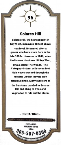 Historic Marker #96 located at 623 Angela Street between Simonton and Elizabeth Streets.This historic site marks the highest point in Key West. It measures 18 feet above sea level. Its height became increasingly important as low level development fell prey to flooding from heavy storms and hurricanes.In the early 1800s, Solares Hill was known as The Woods. It was a small timber forest standing at the outskirts of town. The hill and surrounding neighborhood was later named Solares Hill for Mr. Solares who had a grocery store on the hill in the late 1800s. Locally, hurricanes are recognized as being wind or water events depending on the nature of destruction they bring. Key West's strongest and most devastating hurricane in history was the Havana Hurricane of 1846 (see Historic Marker # 40). The storm hit the island as a Category 4 hurricane bringing extensive wind driven flooding to the island. Torrents of seven foot waves ravaged the town as they washed over the island from the Gulf of Mexico to the Atlantic Ocean.It is recorded that many of the people that survived the storm crawled to Solares Hill and clung to trees and vegetation to ride out the storm. After the storm, only 8 buildings were habitable; the lighthouse had been washed out to sea drowning 14 people, the City Cemetery at Higgs Beach was unearthed, and a salt pond that ran through the center of the town was cut off from the harbor (for more on salt ponds and salt production, see historical marker #56).In response to the hurricane's destruction, the city made a concerted effort to relocate the damaged areas closer to Solares Hill's high ground. The City Cemetery was relocated two blocks from the hill, and the lighthouse was reconstructed on high ground. The salt pond was filled in and became part of the land that downtown Key West is built on.Historically, Key West's livelihood has depended on the Atlantic Ocean and Gulf water that surrounds us. However, one must be equally cognizant of the dangers inherent in living on low, relatively flat land surrounded by water and subjected to the whims of Mother Nature.